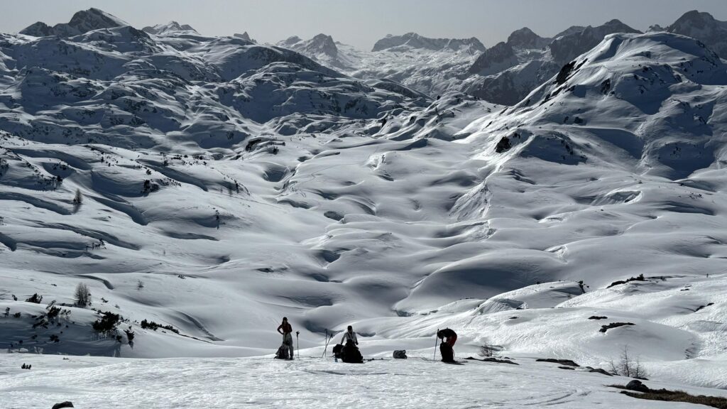 Am nächsten Morgen ging es früh weiter. Der Schnee war noch hart gefroren, und wir stiegen hinauf zum Funtenseetauern. Nach schwieriger Abfahrt erreichten wir den zugefrorenen Funtensee, der tief verschneit und still zwischen den Bergen lag – ein perfekter Ort für eine kurze Pause.
