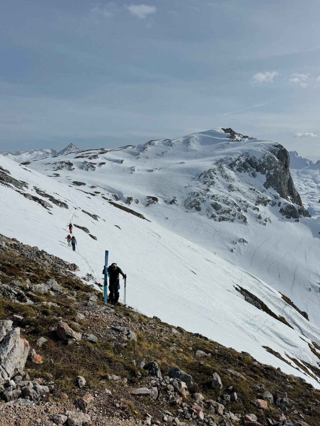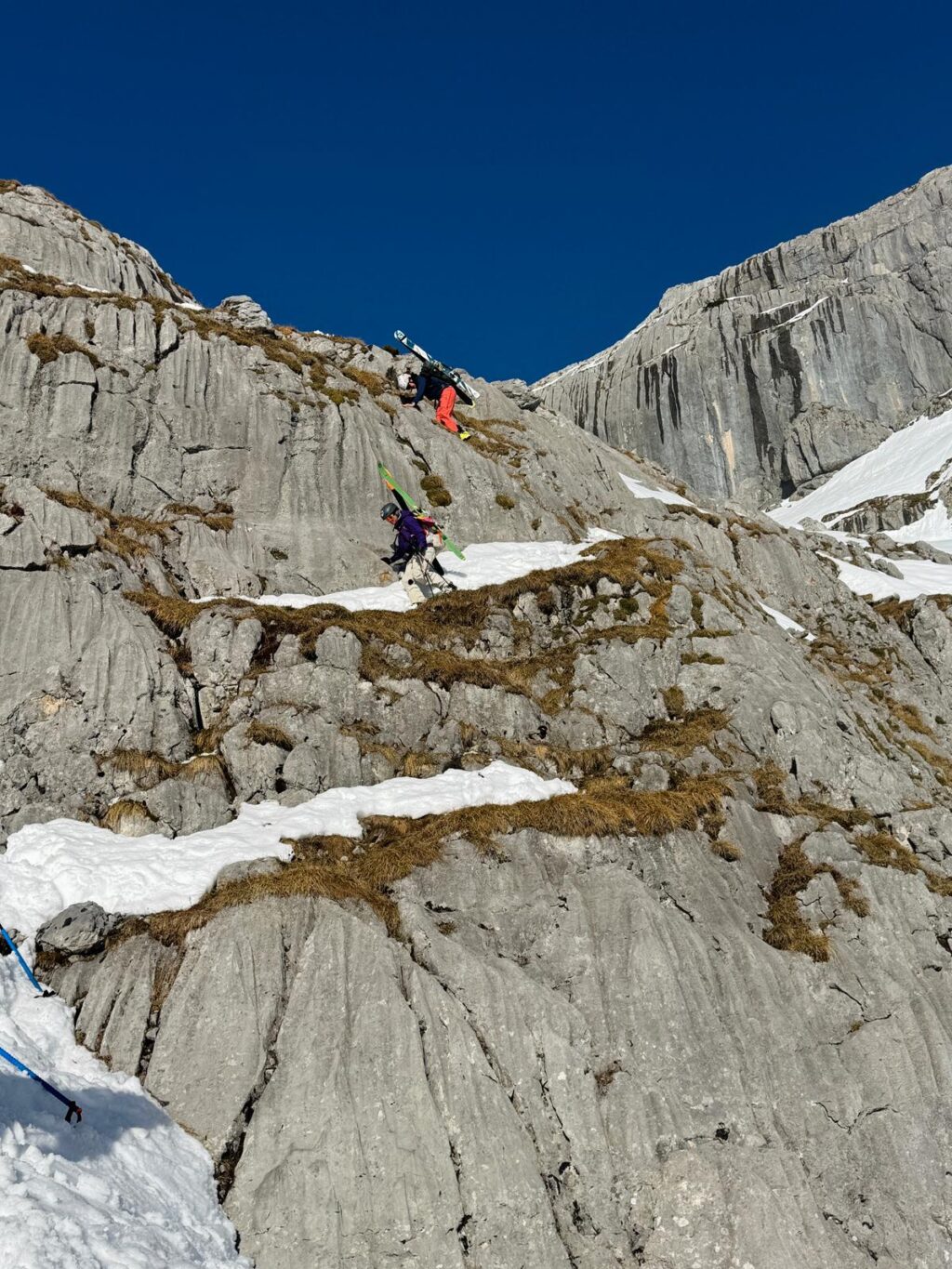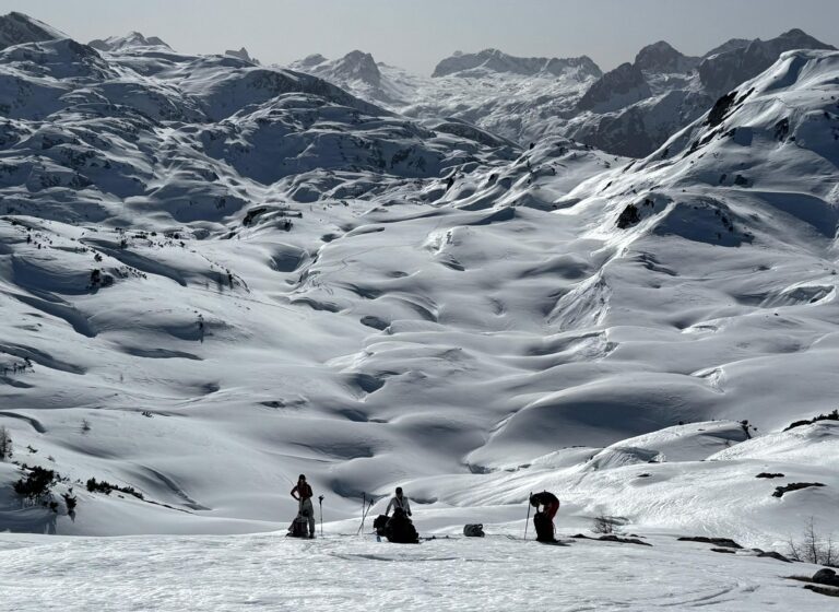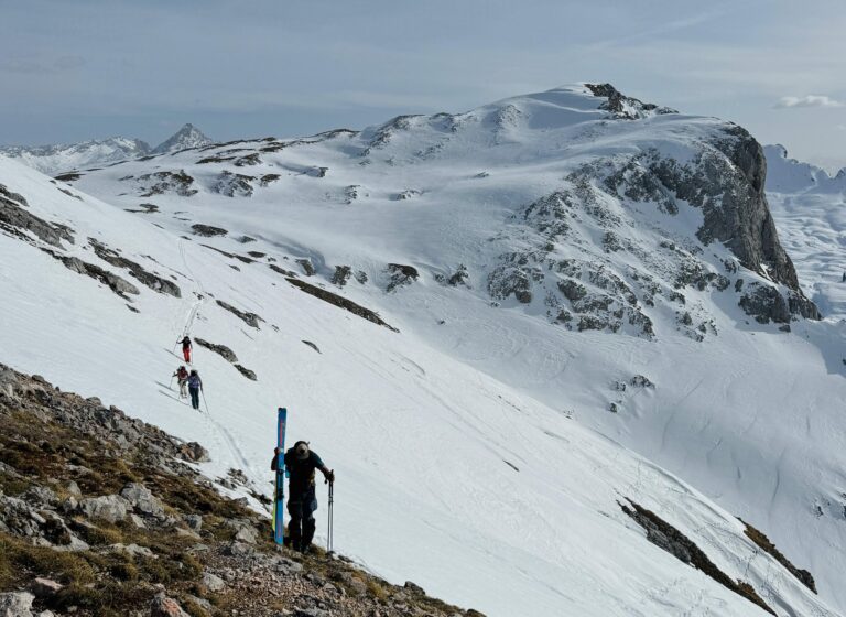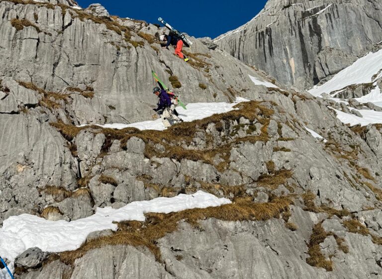 Nach dem Übergang in das Hochplateau des Hagengebirges wurde die Weite und Schönheit dieser Tour sichtbar. Dem Hochkönig immer näher kommend, folgte der spannendste Abschnitt des Tages: der Abstieg durch den Eisgraben. Das Gelände wurde steiler und alpiner. Am Ende des Eisgrabens mussten wir vorsichtig 10m abklettern. Der Eisgraben wirkt rau und ursprünglich – eine eindrucksvolle Passage, die volle Aufmerksamkeit verlangt. Auch hier ist der Klimawandel bereits deutlich sichtbar, denn der Schnee reicht bei weitem nicht mehr aus. Diese Stelle wird in Zukunft immer mehr eine Herausforderung der großen Reibn werden.