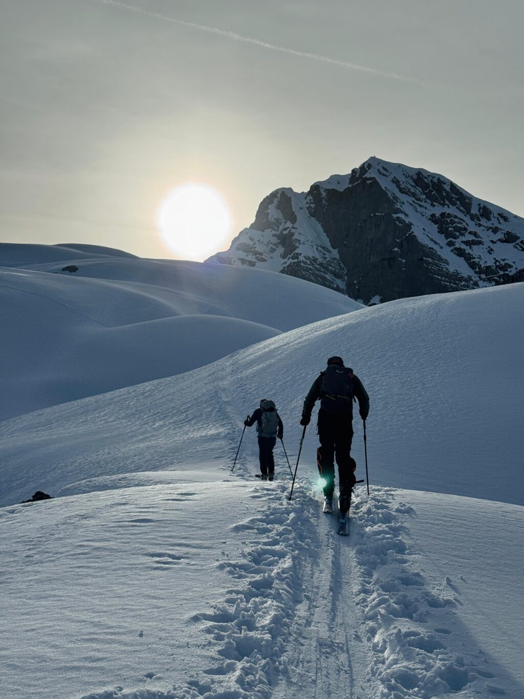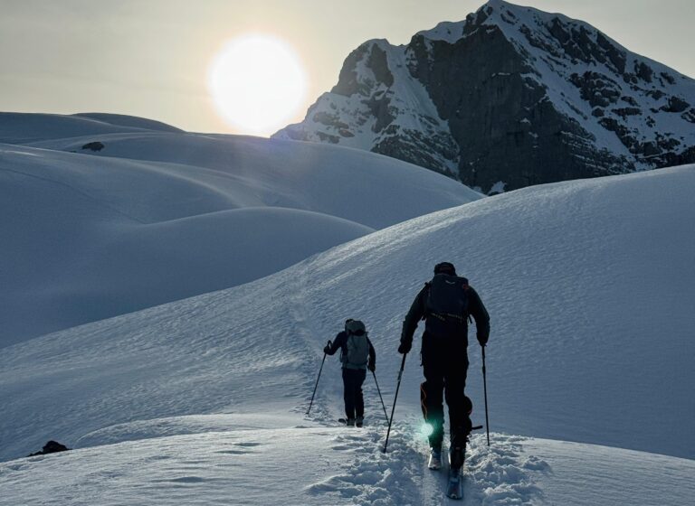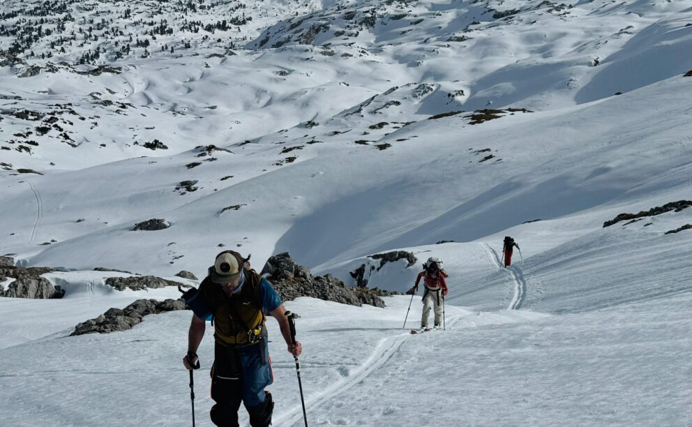Früh am Morgen starteten wir am Parkplatz Hinterbrand oberhalb von Berchtesgaden. Die Sonne ging gerade auf, und die ersten Meter führten noch gemütlich über bekannte Skitourenwege. Die Spur zog sich langsam hinauf Richtung Schneibstein. Die Bedingungen scheinten gut zu sein.
