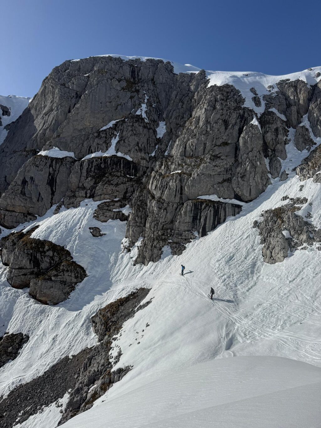 Danach führte die Route weiter über die Diesbachscharte um den großen Hundstod. Nach einem letzten Gegenanstieg ging es hinunter in den Loferer Seilergraben, mit großartigem Skigelände. Leider waren die Bedingungen am Nachmittag eher schwierig.